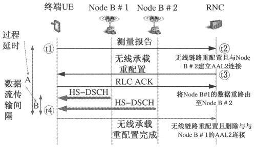 圖2中,傳輸時間間隔用時刻B表示,該時間可以忽略,因為UE從源小區(qū)到目標(biāo)小區(qū)的切換是與網(wǎng)絡(luò)同步的。因此,對于像VoIP這樣的低延時實時業(yè)務(wù)來說,HSPA可以提供無縫的移動性。