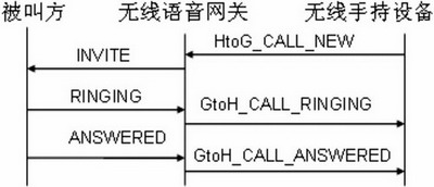 當(dāng)用戶通過無線手持設(shè)備撥打一個(gè)號碼時(shí),無線手持設(shè)備將發(fā)送一個(gè)HtoG_CALL_ NEW的內(nèi)部會話信令連同呼叫的號碼給無線語音網(wǎng)關(guān),無線語音網(wǎng)關(guān)收到該信令后,將根據(jù)該信令構(gòu)造相應(yīng)的SIP消息并發(fā)送到外部網(wǎng)絡(luò)。當(dāng)無線語音網(wǎng)關(guān)收到來自被叫方表示振鈴信息的暫時(shí)應(yīng)答RINGING時(shí),將發(fā)送一個(gè)GtoH_CALL_RINGING的內(nèi)部會話信令給手持設(shè)備。當(dāng)無線語音網(wǎng)關(guān)收到來自被叫方表示應(yīng)答的信息ANSWERED時(shí),語音網(wǎng)關(guān)將啟動RTP線程并發(fā)送一個(gè)GtoH_CALL_ANSWERED的內(nèi)部會話信令給手持設(shè)備以通知被叫方已應(yīng)答。此時(shí)手持設(shè)備開啟語音進(jìn)程,與被叫方實(shí)現(xiàn)通話。