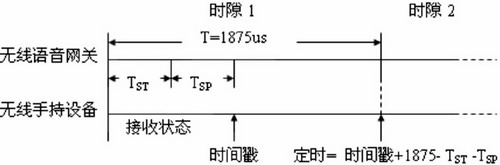 時(shí)隙1開始后,語音網(wǎng)關(guān)需要TSTms的時(shí)間將射頻芯片從空閑狀態(tài)轉(zhuǎn)換為發(fā)送狀態(tài),當(dāng)轉(zhuǎn)換為發(fā)送狀態(tài)后,預(yù)先存儲在射頻芯片發(fā)送RAM中的信標(biāo)幀立即開始發(fā)送,手持設(shè)備上的射頻芯片在收到六個(gè)字節(jié)TSPms后自動鎖存一個(gè)當(dāng)前時(shí)間timestamp(時(shí)間戳),