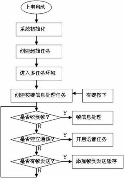 當(dāng)手持設(shè)備上電啟動后,其工作流程如圖7示。首先進(jìn)行的是系統(tǒng)的初始化,包括處理器初始化,操作系統(tǒng)mC/OS-II初始化,LCD,鍵盤,射頻模塊等的初始化。之后建立起始任務(wù)并通過OSStart()函數(shù)進(jìn)入多任務(wù)環(huán)境。此時(shí)起始任務(wù)占用CPU資源,在起始任務(wù)中,建立按鍵信息處理任務(wù)并通過信號量機(jī)制掛起。然后判斷是否收到來自無線語音網(wǎng)關(guān)的幀,如果有,調(diào)用frame_deal()函數(shù)處理幀信息,在該函數(shù)中調(diào)用call_command_deal()完成無線網(wǎng)內(nèi)部會話信令的處理。接著判斷通話是否建立,如果建立則創(chuàng)建語音任務(wù),在語音進(jìn)程中使能PCM編解碼芯片,并進(jìn)行g(shù).726壓縮編碼。最后判斷是否有幀需要發(fā)送給無線語音網(wǎng)關(guān),如果有則把幀添加到發(fā)送緩存,等待發(fā)送時(shí)隙到來。這一過程完成以后重新跳到判斷是否收到來自無線語音網(wǎng)關(guān)的幀,重復(fù)以上過程。如果有鍵盤中斷,將會釋放一個(gè)信號量,該信號量將解掛按鍵信息處理任務(wù)。該任務(wù)對鍵盤輸入信息進(jìn)行處理。