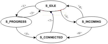 呼叫有四種狀態(tài):“S_IDLE”、“S_PROGRESS”、“S_INCOMING”、“S_CONNECTED”,它們之間的關(guān)系用一個(gè)有限狀態(tài)機(jī)來描述,如圖3。