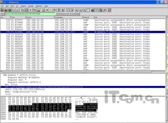 分析結(jié)果:除了可以看到有UPnP協(xié)議,DHCP發(fā)現(xiàn)協(xié)議等網(wǎng)絡(luò)協(xié)議外沒(méi)有發(fā)現(xiàn)任何已知的VoIP協(xié)議且協(xié)議被加密。加密技術(shù)和Skype類似,每一次通話使用的端口都不相同。