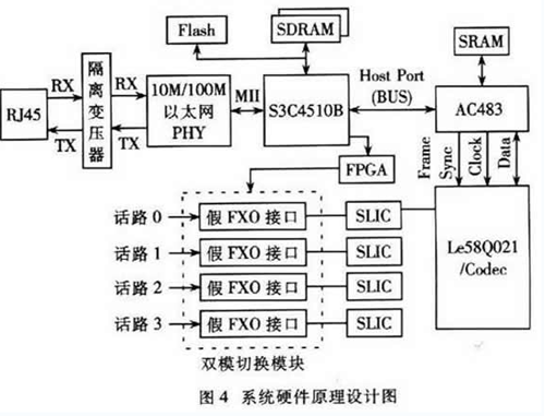 本節(jié)提出了一種基于H.323的雙模網(wǎng)關(guān)的系統(tǒng)設(shè)計(jì)方案,該方案支持4路話音,使用一種經(jīng)濟(jì)實(shí)用的“假FXO接口”方式實(shí)現(xiàn)雙模切換,能夠在VoIP通話時(shí)檢測到PSTN線上進(jìn)來的呼叫并可通過按話機(jī)的拍簧或者Flash閃斷鍵切換接聽!