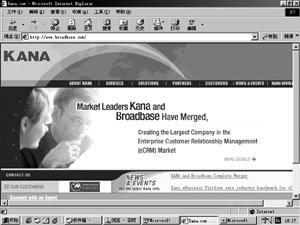 Kana是美國(guó)在線(xiàn)服務(wù)領(lǐng)域的知名公司,其eCRM軟件在客戶(hù)關(guān)系管理領(lǐng)域極具代表性。Kana公司剛開(kāi)始只提供電子郵件響應(yīng)管理技術(shù),但是通過(guò)一系列的收購(gòu)舉措,Kana已經(jīng)可以提供端到端的客戶(hù)服務(wù)解決方案。最近,Kana并購(gòu)了美國(guó)Broadbase公司,成為在線(xiàn)客戶(hù)服務(wù)領(lǐng)域的“巨頭”。該公司的旗艦級(jí)產(chǎn)品主要是針對(duì)Email回復(fù)的客戶(hù)服務(wù)系統(tǒng),Kana的Email客戶(hù)服務(wù)軟件被Yahoo!和AOL等著名的網(wǎng)絡(luò)公司采用。