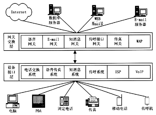 統(tǒng)一消息平臺集成了固定電話網(wǎng)、移動電話網(wǎng)和Internet網(wǎng)絡(luò)。目前,電話網(wǎng)和Internet網(wǎng)各自擁有獨(dú)立的網(wǎng)絡(luò)資源和信息服務(wù)領(lǐng)域,而這兩大網(wǎng)絡(luò)的用戶群存在著很大的交叉。電話的使用在中國已經(jīng)占有很高的普及率,傳統(tǒng)的160/168聲訊服務(wù)已經(jīng)成為中國百姓所熟悉的最具代表性的電話信息服務(wù),而Internet作為在中國剛剛興起的信息媒體,尚需要普通百姓逐漸認(rèn)識它、使用它。統(tǒng)一消息平臺將電話網(wǎng)和Internet網(wǎng)結(jié)合在一起,極大地擴(kuò)大了兩大網(wǎng)絡(luò)各自的用戶群,電話用戶可以用電話或者傳真獲取Internet上的信息,電子郵件服務(wù)也可以不局限于Internet,而能對廣大的電話用戶開放。統(tǒng)一消息平臺為用戶帶來的是信息的方便、及時,使人們在任何時間、任何地點都能夠獲取需要的信息。