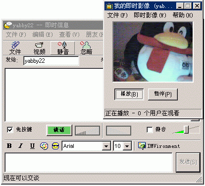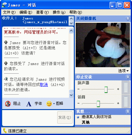 在對你的音、視頻設(shè)備檢查無誤、調(diào)試完畢后,恭喜你!你可以馬上給你的朋友打可視電話了。點擊在線好友的Yahoo! ID,就會彈出一個訊息發(fā)送框(圖6),在菜單欄下面的幾個按鈕中有“視頻”和“語音”兩個按鈕。沒錯!就是它們了,點吧!點擊“視頻”按鈕后彈出了剛才的“我的即時影像”窗口;點擊“語音”按鈕后,訊息發(fā)送框中間部分會多出一條語音顯示和控制的狀態(tài)欄。(見圖7)對方只需右鍵單擊朋友列表中你的Yahoo! ID,并選擇“觀看即時影像”即可看到你的影像并同時聽到你的聲音。OK,開始你們愉快的交流吧。)