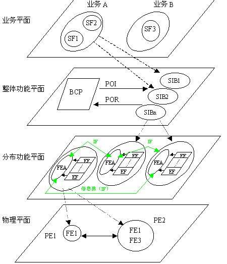 根據(jù)不同的抽象層次,智能網(wǎng)概念模型分為四個平面:業(yè)務(wù)平面、整體功能平面、分布功能平面、物理平面。