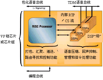 這種新型半導(dǎo)體元件被叫作語(yǔ)音處理器(VP),它不是技術(shù)創(chuàng)新成果,而只是傳統(tǒng)DSP核心和通用RISC處理器在一個(gè)或兩個(gè)硅片上的重新包裝和集成。DSP核心完成VoP的壓縮、回聲抑制和各種信號(hào)處理任務(wù),而RISC處理器完成VoP的匯聚和打包處理。