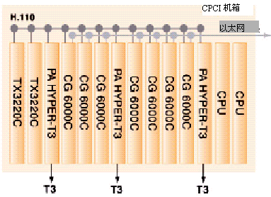 HYPER-T3接入適配板,它用于通過T3線上的1344個端口從PSTN接入語音和傳真媒體。這些媒體會從DS3轉(zhuǎn)換到DS0,然后通過H.110總線發(fā)送給6塊CG6000C中的一塊。CG6000C會壓縮這些語音和傳真媒體,然后用UDP/IP上實時協(xié)議(RTP)對它們進(jìn)行打包。再通過板上的兩個以太網(wǎng)接口發(fā)送到一個語音級的IP包網(wǎng)絡(luò)上。請注意,每種板都使用了N+1板卡級的冗余備份。