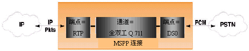 MSPP通道可以是全雙工語音編碼器、傳真轉(zhuǎn)發(fā)編碼器、或者是各種單工通道。在一個普通VoIP網(wǎng)關(guān)應(yīng)用中,一個端點(diǎn)就是一個和PSTN連接的DS0,PSTN連接最常見的是CG6000系列平臺上的T1或E1接口,也可能是T3接口。其它連接是一個通過以太網(wǎng)接口連接到廣域包網(wǎng)絡(luò)(WAN)的RTP話音包端口。通過指定端點(diǎn)和通道類型,很容易開發(fā)出各種包電話應(yīng)用。