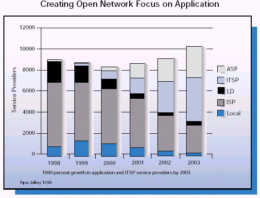 關(guān)于新的業(yè)務(wù)提供商的前景,ASP是最為熱門的,由于整個行業(yè)的外購趨勢,使得它吸引了數(shù)目巨大的風(fēng)險債券和投資。但是如果說他們只是關(guān)注外購那就太籠統(tǒng)了。事實(shí)上一些公司是以托管為中心的,一些是以連通性為中心的,還有一些是以應(yīng)用為中心的。