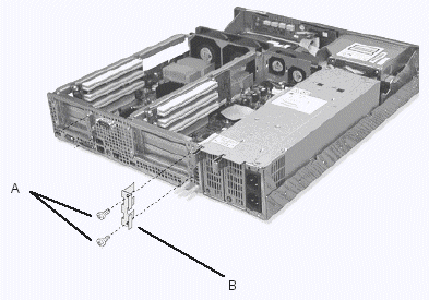 1. 卸下機箱后部用來固定PCI擋板支架的兩顆螺絲釘(參見圖5-6中A);