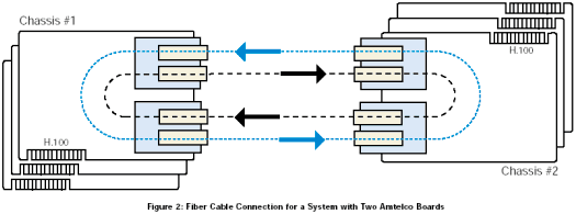 該配置由兩個服務(wù)器組成,其中一個配置成主機,另外一個配置成客戶機。主機通過光纖環(huán)路為整個系統(tǒng)提供時鐘,客戶機則通過光纖環(huán)路得到時鐘。對于主機服務(wù)器,Amtelco卡需要在Dialogic®