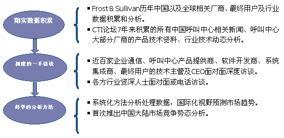 Frost & Sullivan 和 CTI論壇(liumsf.cn)共同組成的調(diào)研小組,在查閱了大量資料的基礎(chǔ)之上,以企業(yè)通信及呼叫中心的設(shè)備應(yīng)用、投資計(jì)劃以及相關(guān)廠商的市場(chǎng)表現(xiàn)為出發(fā)點(diǎn),通過(guò)對(duì)企業(yè)通信及呼叫中心重要應(yīng)用企業(yè)、在市場(chǎng)占主導(dǎo)地位的二十多家設(shè)備廠商、二十多家軟件開(kāi)發(fā)商、十幾家系統(tǒng)集成商、數(shù)家外包運(yùn)營(yíng)商的深度訪談,參閱內(nèi)部相關(guān)報(bào)告及數(shù)據(jù)庫(kù),對(duì)數(shù)據(jù)的來(lái)源和數(shù)據(jù)的準(zhǔn)確性進(jìn)行了詳細(xì)核對(duì)與論證;憑借參與調(diào)研人員的多年從業(yè)經(jīng)