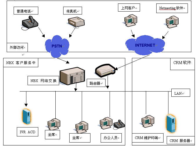 NBX客戶服務中心是基于3Com公司的NBX網(wǎng)絡電話交換機平臺構筑的新一代呼叫中心,首先它擴大了服務方式,客戶不但可以通過電話得到服務,還可以在上網(wǎng)訪問企業(yè)主頁的同時使用耳機、麥克風直接與服務代理人員(AGENT)語音通話,一邊瀏覽網(wǎng)頁,一邊交談,增加交流的信息輔助量。還可以通過電子郵件、傳真等方式完成與企業(yè)信息交流,其次NBX客戶服務中心內(nèi)部數(shù)據(jù)、語音兩網(wǎng)合一的布線結構,不但提高了呼叫中心的穩(wěn)定性,而且使客戶數(shù)據(jù)能與電話語音同步協(xié)調(diào),完成具有針對性的一對一的客戶服務。