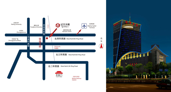 北京遼寧大廈位于北四環(huán)黃金地段,乘坐首都機(jī)場巴士即可到達(dá)。距譽(yù)有"中國硅谷"之稱的中關(guān)村信步可至,毗鄰北大清華,距中外聞名的奧運場館"鳥巢"僅5分鐘車程。地理位置得天獨厚,交通便捷。