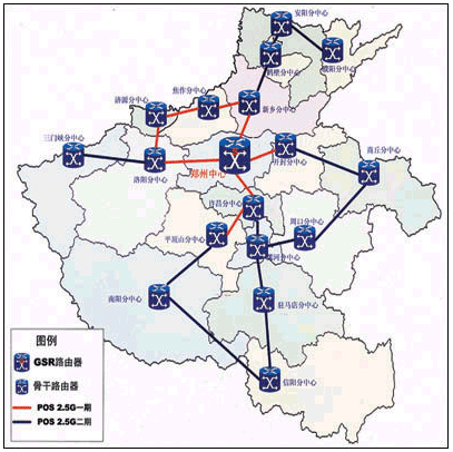 HERNET一期工程主干網(wǎng)采用IP POS技術(shù),應(yīng)用AVVID網(wǎng)絡(luò)體系結(jié)構(gòu),采用骨干傳輸網(wǎng)、城域網(wǎng)、接入網(wǎng)三層設(shè)計方案,以省網(wǎng)絡(luò)中心(設(shè)在鄭州大學(xué)網(wǎng)絡(luò)中心)、地市網(wǎng)絡(luò)中心、校園網(wǎng)三級管理模式。由省網(wǎng)絡(luò)中心向下以2.5G速度連接到各地市網(wǎng)絡(luò)中心,而向上則以155M速度連接到CERNET及Internet。整個一期工程實(shí)現(xiàn)了包括鄭州、許昌、平頂山、開封、洛陽、濟(jì)源、焦作以及新鄉(xiāng)等7個地市的2.5G連接,并形成了一個環(huán)網(wǎng)狀冗余拓?fù)浣Y(jié)構(gòu),確保當(dāng)網(wǎng)絡(luò)的一個節(jié)點(diǎn)出現(xiàn)問題時,數(shù)據(jù)可以通過其他途徑傳輸?shù)侥康牡兀谝黄诠こ掏瓿珊,?0多所大學(xué)、中小學(xué)等教育與科研單位以千兆速度連接到HERNET上,共有近50萬的用戶能夠充分利用高速帶寬獲得教育網(wǎng)資源。