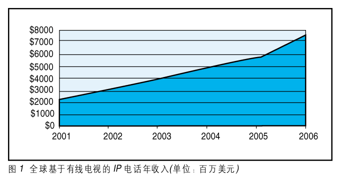 有線電視運(yùn)營商在尋找使用有線電視基礎(chǔ)網(wǎng)絡(luò)HFC的新服務(wù),創(chuàng)造新的經(jīng)濟(jì)增長(zhǎng)點(diǎn),提供數(shù)據(jù)、語音、圖像綜合的服務(wù);谟芯電視系統(tǒng)的IP電話將是第一個(gè)最有可能推出的新服務(wù)。2002年InStat/MDR的分析報(bào)告說2006年基于有線電視的IP電話網(wǎng)將達(dá)到US$75億的年收入,如圖1所示。