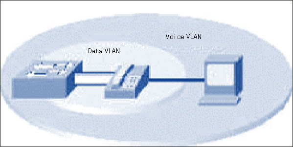 由于QoS、可擴(kuò)展性、可管理性和安全性等原因,IP電話(huà)設(shè)備和IP數(shù)據(jù)設(shè)備應(yīng)該部署在兩個(gè)邏輯上獨(dú)立的網(wǎng)段中。將IP語(yǔ)音與傳統(tǒng)IP數(shù)據(jù)網(wǎng)分離能大大提高抗攻擊能力,而且允許使用相同的接入層、核心層和分布層。