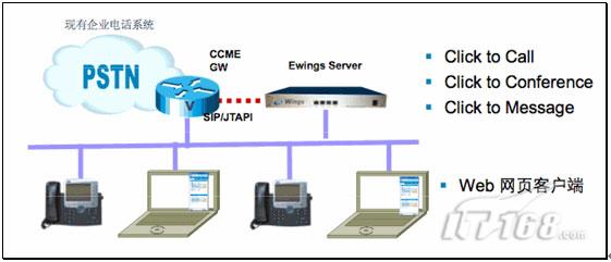 點點通系統(tǒng)配置一臺CISCO 2811集成多業(yè)務(wù)路由器設(shè)備,能提供CCME IP電話的支持,并且可以跟企業(yè)內(nèi)部的現(xiàn)有電話系統(tǒng)對接。另外,點點通系統(tǒng)還有一臺服務(wù)器,這是思科的合作伙伴提供的硬件和軟件,通過它實現(xiàn)和公司目錄的集成和各種對電話的控制功能。這臺服務(wù)器和CCME之間采用SIP或JTAPI的連接。