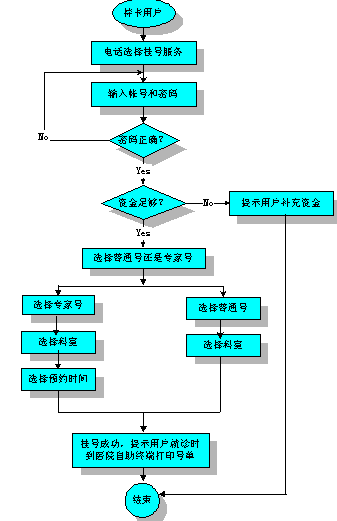 用戶選擇專家門診,系統(tǒng)繼續(xù)提示"請選擇科目,1內(nèi)科,2外科,3五官科,……,"用戶選擇完畢。系統(tǒng)提示:"您要掛的是*科,確認(rèn)按1,重選按0"。