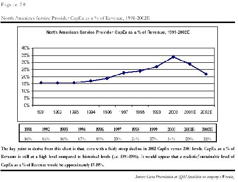 和中國(guó)的問題一樣,制造商的問題是電信服務(wù)企業(yè),即運(yùn)營(yíng)商的投入減少造成的。由于上世紀(jì)末互聯(lián)網(wǎng)和電子商務(wù)泡沫的虛假繁榮的影響,各運(yùn)營(yíng)商都嚴(yán)重高估了市場(chǎng)需求,認(rèn)為需求是會(huì)隨著通信能力的增強(qiáng)無限增加,因此市場(chǎng)規(guī)模是會(huì)無限擴(kuò)張的,他們?cè)谌狈?duì)最終用戶需求的深入分析的前提下,普遍在基礎(chǔ)設(shè)施的建設(shè)上進(jìn)行了超大規(guī)模的投入,其基礎(chǔ)設(shè)施建設(shè)投入在收入中的比例一度在2000年從平均的15%達(dá)到了創(chuàng)記錄的35%。