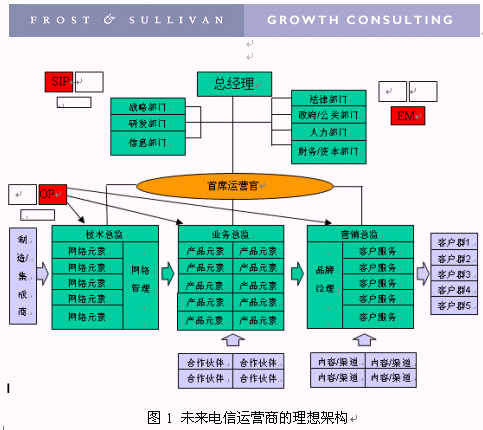 Frost & Sullivan(中國)公司深入研究國際主流運營商的組織結(jié)構(gòu)與管理模式,同時參考了國際上公認(rèn)的eTOM模型,并結(jié)合國內(nèi)電信運營商組織結(jié)構(gòu)的現(xiàn)狀,提出了圖1所示的未來電信運營商的理想架構(gòu)。理想架構(gòu)的確定對電信運營管理的變革具有重要的意義。只有事先明確了方向,并且對未來達(dá)成了廣泛一致的共識,才能對目標(biāo)過程進(jìn)行分解,有步驟、有方法、有成效的完成目標(biāo)。