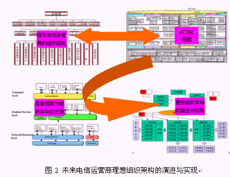 現(xiàn)有的電信運營商的管理架構(gòu)向理想的管理組織架構(gòu)演進(jìn)過程中,要涉及到不同的中間過程和步驟,對中間過渡狀態(tài)的評估和有效實現(xiàn),是實現(xiàn)演進(jìn)的關(guān)鍵,F(xiàn)有組織架構(gòu)管理職能的對應(yīng),業(yè)務(wù)流程的標(biāo)準(zhǔn)化,管理流程的標(biāo)準(zhǔn)化,企業(yè)IT支撐架構(gòu)對業(yè)務(wù)職能部門的支撐,這些環(huán)節(jié)都是運營商應(yīng)該重點考慮的中間內(nèi)容。圖2顯示了未來電信運營商理想組織架構(gòu)的演進(jìn)與實現(xiàn)過程。其中的任何一個環(huán)節(jié)都是電信運營管理研究的核心課題,也直接影響到了電信運營管理變革的成敗。