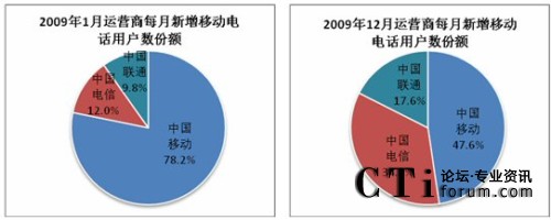 考查三大運(yùn)營(yíng)商2009年的每月新增用戶(hù)數(shù)份額:中國(guó)移動(dòng)每月新增用戶(hù)數(shù)份額從1月的78.2%下降到12月的47.6%,顯然,中國(guó)移動(dòng)每月用戶(hù)增速逐漸放緩,而中國(guó)電信和中國(guó)聯(lián)通的每月新增用戶(hù)數(shù)份額呈增長(zhǎng)趨勢(shì)。