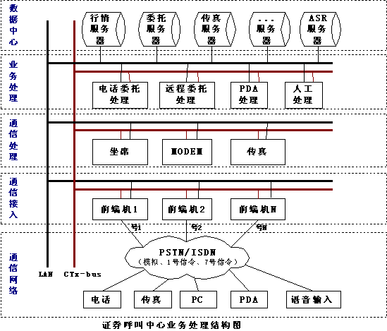 第一種方案是在證券營業(yè)部加專用的前端機和處理機,申請獨立的電話線路來處理PDA的委托,PDA和營業(yè)部前端機采用雙向或單向的DTMF收發(fā)的方式完成通訊。根據(jù)市場的情況來看,這種方式不容易被證券營業(yè)部和股民接受,證券營業(yè)部要申請一定數(shù)量的電話線路,和證券電話委托的線路不能共用,增加了營業(yè)部的費用。由于線路的限制,股民在做委托查詢時往往出現(xiàn)線路阻塞等情況,另外DTMF通訊方式的有速度慢,信息容量有限,抗干擾性差等缺點,股民不容易接受。目前東方潮公司的“東方獵人”的委托就是采用這種方式。