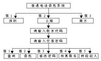 通過該項(xiàng)服務(wù),股民可以在任何地點(diǎn)使用任何一部雙音頻電話方便的向證券公司發(fā)出買入、賣出等各種委托指令,也可以發(fā)出查詢指令,證券公司的電話委托交易系統(tǒng)根據(jù)股民的指令自動完成委托及查詢操作,將結(jié)果反饋給股民。股民發(fā)給證券公司的信息,主要為數(shù)碼、數(shù)字,通過雙音頻電話按鍵來傳送。證券公司電話委托交易系統(tǒng)發(fā)給股民的信息,則是用語音傳送的操作及查詢結(jié)果。通過功能擴(kuò)充,還可提供其它配套服務(wù),如將查詢結(jié)果發(fā)送至股民的傳真機(jī)。若股民利用計算機(jī)接至委托公司,還可享受可視委托等更為多樣的服務(wù)。