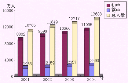 2001年,中國(guó)大陸中學(xué)學(xué)生人數(shù)已達(dá)10765萬(wàn)人,而且學(xué)生人數(shù)還在快速增長(zhǎng)。初中學(xué)生人數(shù)以每年6.5%的速度增長(zhǎng),普通高中學(xué)生人數(shù)也以每年10%-11%的速度增長(zhǎng)。可以看出,教育市場(chǎng)巨大的潛力和商機(jī)。