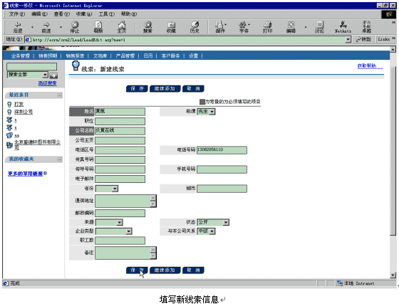 。。比如現(xiàn)在有一個(gè)新客戶黃航的電話13082856110呼入Ebanswers呼叫中心,console控制臺(tái)接收到這個(gè)電話號(hào)碼以后,會(huì)產(chǎn)生一個(gè)URL鏈接地址tel=217,以參數(shù)的形式附在調(diào)用的CRM頁面http://ecrm/crm2/default.asp?retURL=http://ecrm/crm2/search/searchtel_xml.asp后面,當(dāng)話務(wù)員登錄以后,就會(huì)彈出相應(yīng)的添加新線索頁面,話務(wù)員填寫好相關(guān)信息后,按下"保存"按鈕就可以建立新線索了。
