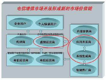 在電信增值市場開放的背景之下,新的市場價值鏈正在形成(如圖所示)。國內(nèi)電信建設(shè)轟轟烈烈的大規(guī);A(chǔ)設(shè)施投資已是明日黃花,改善應(yīng)用“稀缺”的現(xiàn)狀才是當(dāng)務(wù)之急。李峻認(rèn)為,信息產(chǎn)品技術(shù)服務(wù)提供商最主要的任務(wù),就是幫助運(yùn)營商開發(fā)針對中國市場的增值業(yè)務(wù),并帶動其主業(yè)協(xié)同發(fā)展。即面向電信網(wǎng)絡(luò)運(yùn)營商以及虛擬運(yùn)營商,提供增值業(yè)務(wù)系統(tǒng)整體解決方案及其軟硬件支撐平臺和應(yīng)用系統(tǒng)。