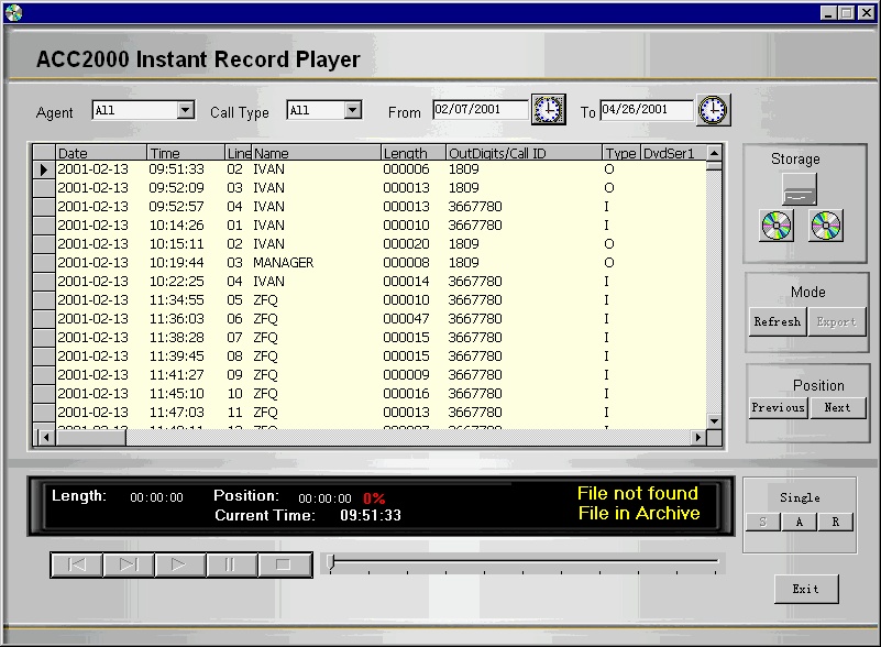 ACC2000 多媒體溝通中心采用最先進(jìn)的海量存儲(chǔ)設(shè)備DVD RAM構(gòu)建實(shí)時(shí)多通道語(yǔ)音錄制、備份系統(tǒng)��ACC2000 DVD Record Backup。這個(gè)系統(tǒng)可以根據(jù)管理員設(shè)定的錄音對(duì)象,對(duì)符合錄音條件的通話自動(dòng)進(jìn)行錄音!