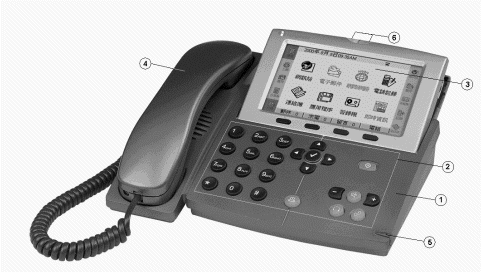 InfoPhone與普通電話機(jī)的最大區(qū)別在于:她擁有增強(qiáng)型的操作面板(圖中標(biāo)識2),超清晰的液晶顯示螢?zāi)? 圖中標(biāo)識3),手感舒適的點(diǎn)觸筆(圖中標(biāo)識5),實(shí)用型的狀態(tài)指示燈(圖中標(biāo)識6)。通過點(diǎn)觸筆和操作面板上的按鍵點(diǎn)選和控制液晶顯示螢?zāi)簧系倪x項(xiàng),完成相應(yīng)的操作。
