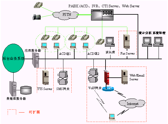 · 交互式語(yǔ)音應(yīng)答(IVR)系統(tǒng)。通過(guò)IVR系統(tǒng),用戶可以從該系統(tǒng)中獲得預(yù)先錄制的數(shù)字或合成語(yǔ)音信息。先進(jìn)的IVR系統(tǒng)甚至已具備了語(yǔ)音信箱、互聯(lián)網(wǎng)和語(yǔ)音識(shí)別的能力。IVR可以利用駐留在數(shù)據(jù)庫(kù)中的信息篩選來(lái)話并選擇傳送路由,也可與主計(jì)算機(jī)連接,使呼叫者得以直接訪問(wèn)主機(jī)數(shù)據(jù)庫(kù)信息。IVR可以自動(dòng)回復(fù)他們,大大提高了工作效率。