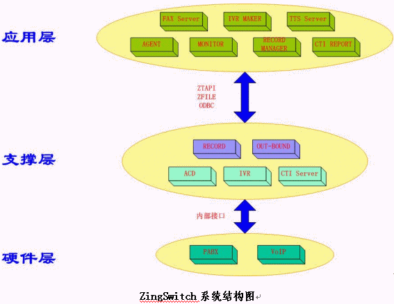 在以上三層結(jié)構(gòu)中,前兩層與具體業(yè)務(wù)系統(tǒng)無(wú)關(guān)。上層業(yè)務(wù)系統(tǒng)的多種變化,不會(huì)影響下層的穩(wěn)定;而下層規(guī)范地進(jìn)行優(yōu)化和擴(kuò)展后,上層的所有應(yīng)用都可在業(yè)務(wù)功能上得到擴(kuò)展。這樣,用戶的業(yè)務(wù)應(yīng)用系統(tǒng)自身可以有多種功能和性能的變動(dòng)和擴(kuò)展,同時(shí),當(dāng)基于ZingSwitch一體化交換機(jī)的呼叫中心系統(tǒng)平臺(tái)在進(jìn)行擴(kuò)容、升級(jí)的時(shí)候,原來(lái)已經(jīng)無(wú)縫掛接其上的用戶的業(yè)務(wù)應(yīng)用系統(tǒng)也無(wú)需任何更改即可運(yùn)行。