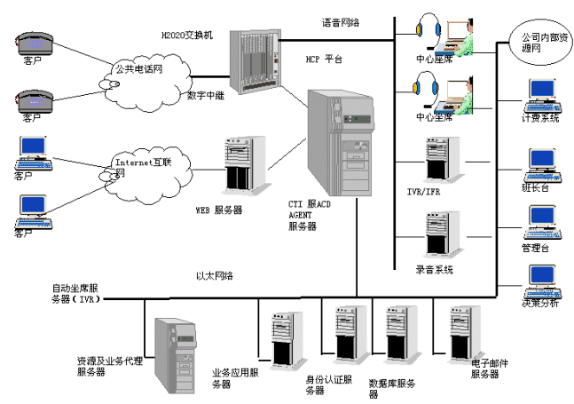 該方案完全以服務(wù)為核心,是基于軟件的呼叫中心解決方案,它采用網(wǎng)絡(luò)分布式多層對(duì)象體系,采取全媒體的接入方式,整合了從尋呼、電話、傳真、短信息到電子郵件、WEB/IP與各種資源,從而形成一個(gè)統(tǒng)一的服務(wù)平臺(tái)。