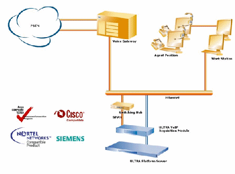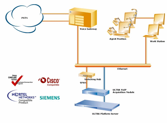 ULTRA平臺的VoIP錄音方案可真正實現(xiàn)純軟件解決方案,可由客戶自行配置符合要求的錄音服務器,安裝ULTRA平臺的軟件即可。另外,對于不能提供具備SPAN功能的網(wǎng)絡使用環(huán)境,ULTRA平臺也可提供相應的模塊產品(ULTRA