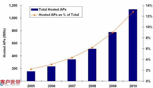 根據(jù)datamonitor在2006年的分析,自2005年起,全球呼叫中心托管的總數(shù)約二十萬個(gè)座席,占全球呼叫中心的總座席數(shù)得2%,到2008年成長到約五十萬個(gè)座席,占總量的6%左右,在2010年時(shí)更會(huì)成長到超過一百萬個(gè)座席占總數(shù)的10%左右。所以整個(gè)托管市場來說將會(huì)持續(xù)不斷的成長(見圖二)。