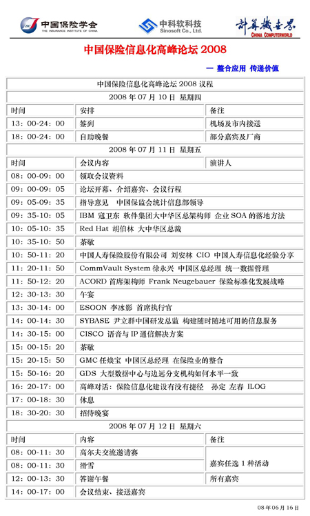 7月10日至12日, 中國(guó)保險(xiǎn)信息化高峰論壇2008將于北京順義區(qū)喬波國(guó)際會(huì)議中心盛大舉行, 此次大會(huì)的邀請(qǐng)來(lái)賓有包括中國(guó)人保,太平保險(xiǎn),中國(guó)人壽,中國(guó)太平洋保險(xiǎn),華泰保險(xiǎn),陽(yáng)光財(cái)險(xiǎn)等保險(xiǎn)業(yè)的最優(yōu)秀的企業(yè)。億迅作為最佳廠商之一,也得到該會(huì)主辦方的盛情邀請(qǐng),屆時(shí)將與各大保險(xiǎn)企業(yè)技術(shù)主管,保險(xiǎn)公司副總經(jīng)理,保監(jiān)會(huì)相關(guān)領(lǐng)導(dǎo)以及資深保險(xiǎn)行業(yè)信息化建設(shè)專家共同聆聽來(lái)自保監(jiān)會(huì)領(lǐng)導(dǎo)的指導(dǎo)性意見,交流重要企業(yè)的優(yōu)秀解決方案,分享系統(tǒng)集成商的最直接方案對(duì)比。會(huì)議期間,億迅公司大中華區(qū)執(zhí)行副總張佑佶先生將有一個(gè)演講時(shí)段,與保險(xiǎn)業(yè)的新老朋友共同研討“呼叫中心信息化在兩岸三地的魅力趨勢(shì)”,全情期待中……
