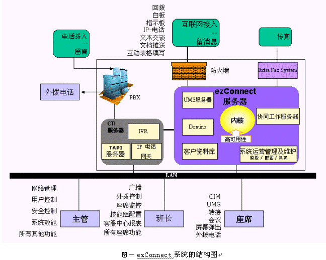 ezConnect系統(tǒng)是由訊泰信息科技公司的北京研發(fā)中心設(shè)計開發(fā)出來的一個成熟的多媒體呼叫中心產(chǎn)品。支持傳統(tǒng)電話、web、電子郵件、傳真、語音郵件、IP電話、短消息、WAP等用戶接入方式;對客戶請求采用基于座席技能的智能分派;提供文本交談、白板共享、協(xié)同填表、文檔推送、IP電話、短消息發(fā)送等多種實(shí)時交流工具;有非常實(shí)用的實(shí)時監(jiān)控和報表子系統(tǒng)。核心部分的設(shè)計采用分離分層的思想,實(shí)現(xiàn)了相對于PBX、IVR、CRM的透明性。系統(tǒng)的配置非常靈活,可以在很短的時間內(nèi)完全改變整個客戶端的風(fēng)格,或支持一種新的語言。整個系統(tǒng)建立在Java平臺上,具有良好的可移植性。下面是ezConnect系統(tǒng)的結(jié)構(gòu)圖:
