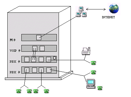 圖中假設(shè)客戶安裝了兩塊PBX板卡和一塊VOIP板卡,產(chǎn)品的板卡都插在計(jì)算機(jī)主板上的插槽上。系統(tǒng)的布線如圖所示,PBX板卡上有外線端口和分機(jī)端口(ISA型號的每個插口接4條線、PCI型號的每個插口接2條線),外線接在外線端口上,分機(jī)線接在分機(jī)端口上。VOIP板卡有2個插口,每個插口接2條線。用戶如果要使用VOIP功能,需要從分機(jī)端口接出線到VOIP端口中。客戶使用網(wǎng)絡(luò)電話時,只要呼叫連接VOIP端口的分機(jī)號碼即可撥通網(wǎng)絡(luò)電話。