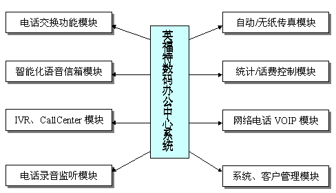 模塊包括:一號通功能、語音留言、留言通知功能、客戶通過密碼遠(yuǎn)程登錄控制功能、與電子郵件集成的語音郵件(Voice Mail)系統(tǒng)、群組廣播功能等功能。