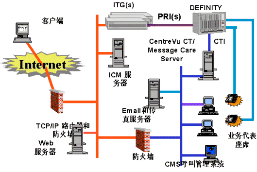 Internet呼叫中心(Internet Call Center簡(jiǎn)稱(chēng)ICC)是當(dāng)前的一個(gè)明顯趨勢(shì)。支持因特網(wǎng)作為呼叫中心的訪問(wèn)渠道會(huì)極大增強(qiáng)呼叫中心的可用性。Internet用戶可以通過(guò)主頁(yè)瀏覽、電子郵件、在線Chat、IP語(yǔ)音電話等方式與話務(wù)員建立在線聯(lián)系,得到優(yōu)質(zhì)的服務(wù)。AVAYA的Internet呼叫中心解決方案支持用戶采用一條電話線進(jìn)行因特網(wǎng)和IP電話的訪問(wèn),ICM管理器與Web服務(wù)器建立連接,將到來(lái)的IP呼叫進(jìn)行自動(dòng)分配,ITG IP電話網(wǎng)關(guān)實(shí)現(xiàn)將IP語(yǔ)音流轉(zhuǎn)換成語(yǔ)音信號(hào),經(jīng)E1線送到Definity交換機(jī)后傳到話務(wù)員座席。座席和用戶可實(shí)現(xiàn)瀏覽器同步等功能。