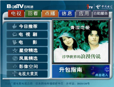 上海IPTV業(yè)務(wù)自2006年9月1日放號以來,發(fā)展十分迅速。截止10月7日,上海電信IPTV業(yè)務(wù)共計(jì)發(fā)展用戶達(dá)2.2萬。如下是上海IPTV商用系統(tǒng)EPG頁面: