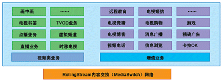 奔流(RollingStream)系統(tǒng)不僅僅支持以LiveTV、Timeshift-TV、VOD、TVOD等為基礎(chǔ)的各項(xiàng)功能,而且具有良好的功能上的可擴(kuò)展性,在此平臺上可以支持眾多豐富多彩的增值互動業(yè)務(wù);诒剂(RollingStream)具有無限的業(yè)務(wù)增長空間,如下圖所示意: