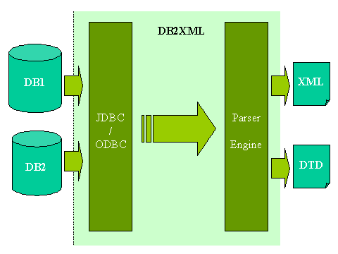 DB2XML中通過JDBC或JDBC-ODBC橋接各種現(xiàn)存的數(shù)據(jù)庫,訪問數(shù)據(jù)庫中的表;通過XML parser構造出代表數(shù)據(jù)庫內(nèi)容的XML文件。DTD文件描述了從數(shù)據(jù)庫中的表到XML文件的對應關系。上圖描述了DB2XML的輸入輸出關系。事實上DB2XML是按照以下步驟完成轉化工作的: