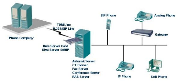 Asterisk IP PBX與Diva Server結合就能夠實現(xiàn)IP PBX與呼叫中心完美結合的一體化解決方案,該方案結合了IP網的靈活性及Eicon